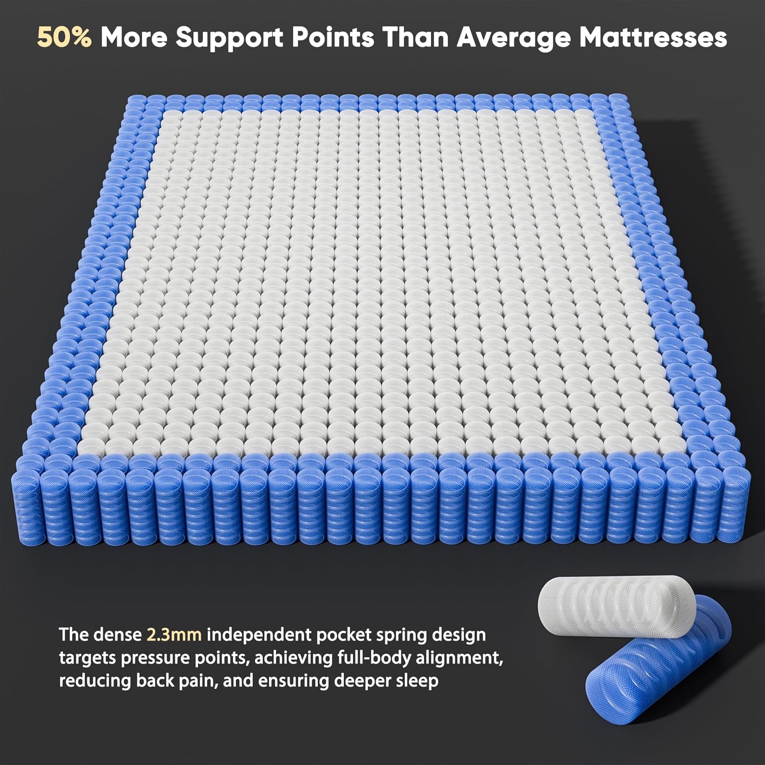 - LUXURIOUS COMFORT & OPTIMAL SUPPORT FOR UNPARALLELED SLEEP - This king mattress features an innovative blend of individually pocketed springs and premium memory foam, evenly distributing your weight from head to toe to relieve pressure points, eliminate body fatigue and aches, while offering superior pressure - relief support for every body contour. Plus, its unique combination enhances breathability, transforming your sleep into a world - class comfort experience night after night