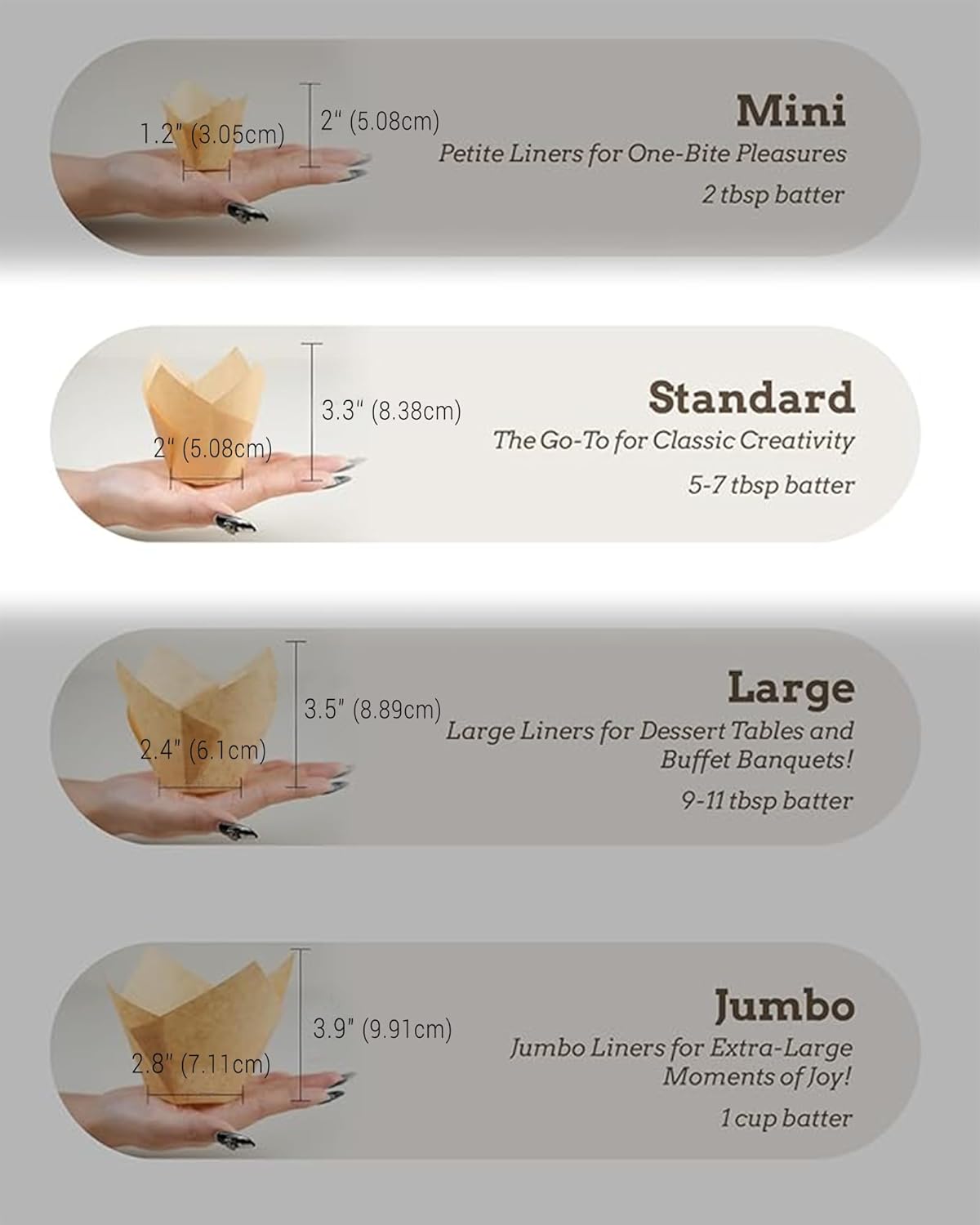 - Size/Color: Package includes 200 unbleached pieces of tulip cupcake liners in total. The bottom diameter of these cupcake cups is 1.97 inches (5 cm), fitting standard muffin or cupcake pan. The depth is 2.2 inches (5.5 cm) at the low point and 3.15 inches (8 cm) at the high point with a capacity of 3 oz.