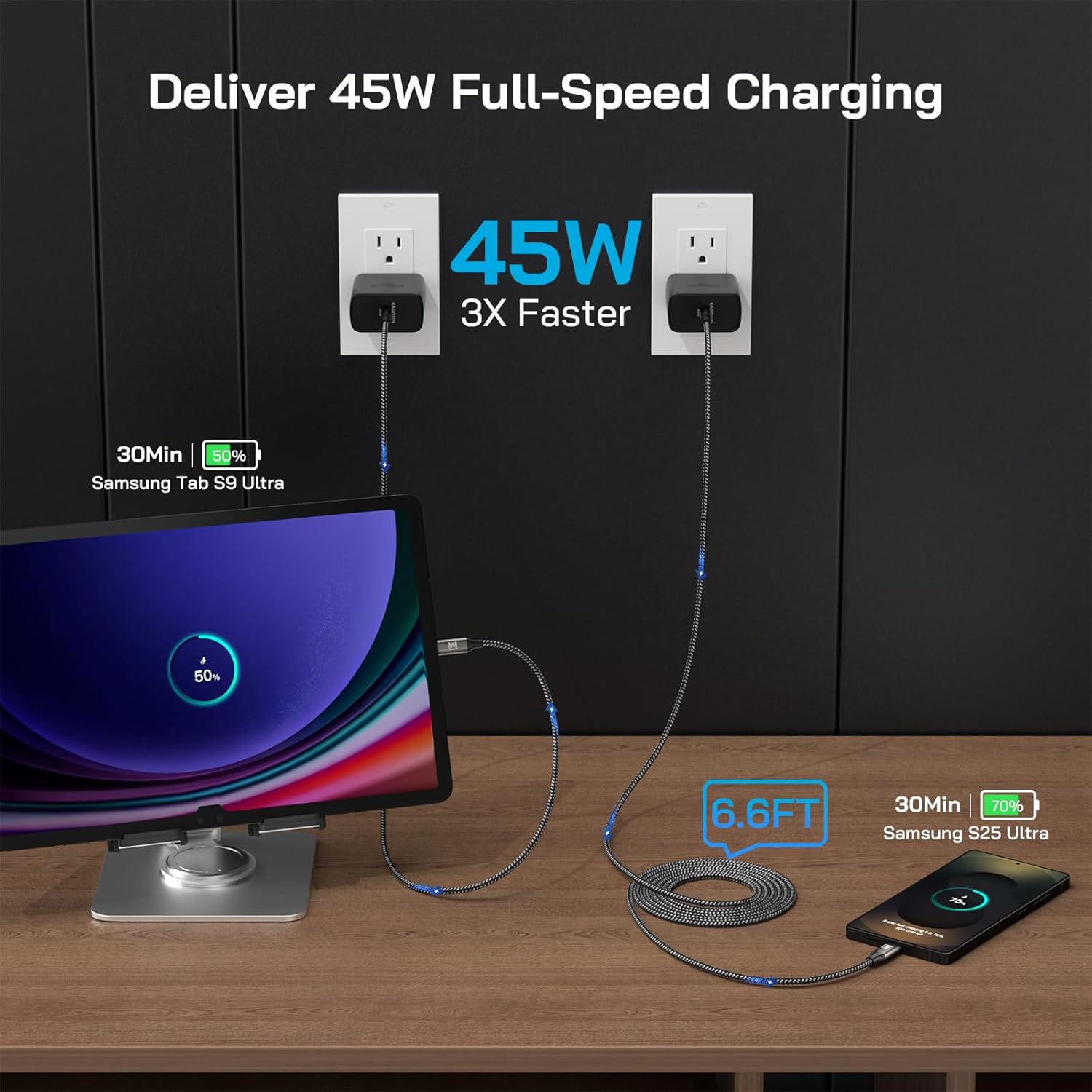 - One Fits All- This portable 45W USB-C Charger pack broadly fits almost any personal devices from phones, tablets to laptops, and especially, provides optimized charging for Samsung, [45W Super-Fast Charging 2.0]: for Samsung Galaxy S25 Ultra/S25+/S24 Ultra/S24+/S23 Ultra/S23+/S22 Ultra/S22 Plus/S20 Ultra/Note 10+, Galaxy Tab S8/Ultra; [25W Super-Fast Charging 1.0]: for Samsung Galaxy S25/S24/S23/S22/S21+/S21 Ultra/FE/S20+; [PD Fast Charging]: Mac Book, i Pad, i Phone, Switch, for Steam Deck..