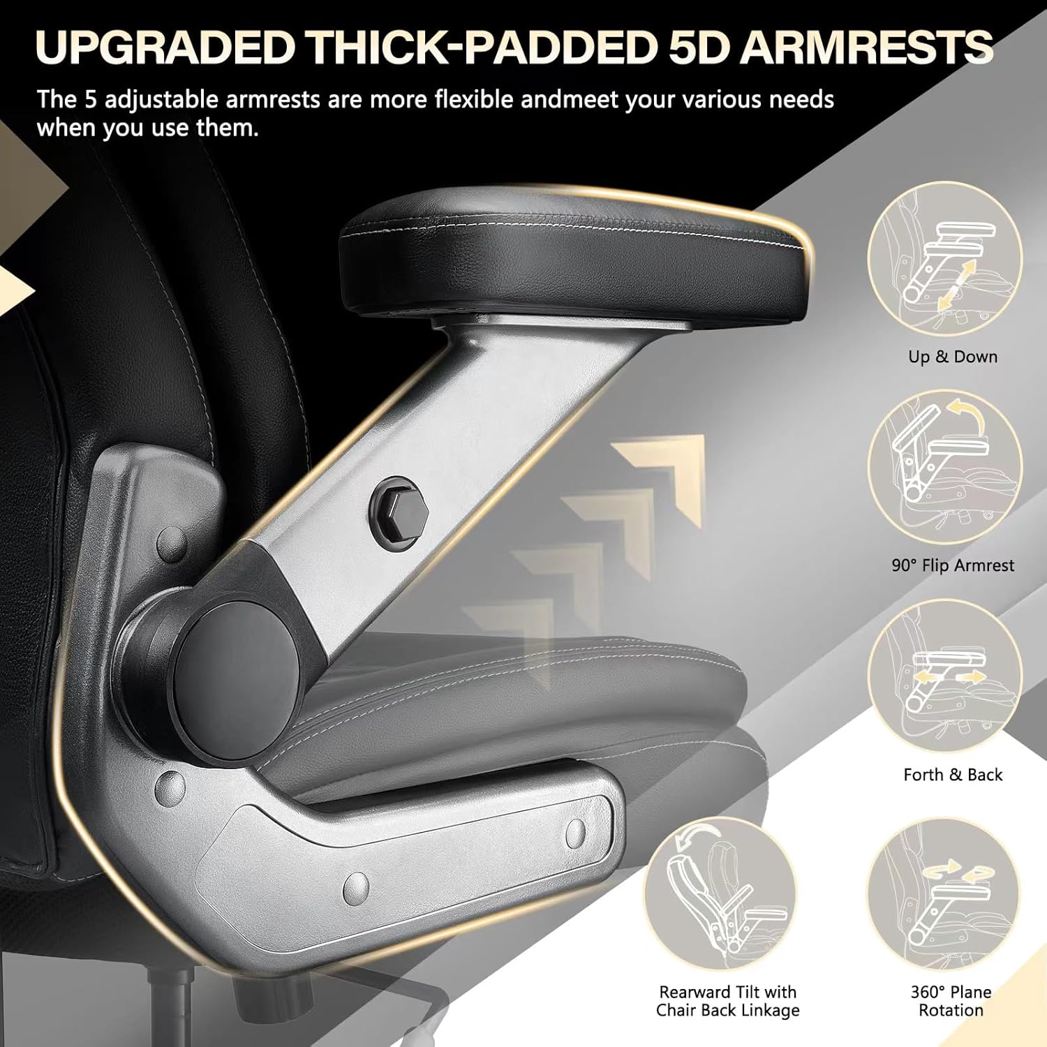 - Space-Efficient 5D Armrests with Optimized Utilization: Need a stylish large home office chair for your work-from-home or shared office setup? No problem! The big and tall office chair with its ergonomic 5D flip arm design minimizes spatial requirements. The arm rests can be mounted on the back and then you can push them back for no arm rest which is very comfortable and handy. Prepare to swivel and roll your way to productivity paradise! This large desk chair doesn't just sit there looking pretty. It's a multitasking marvel