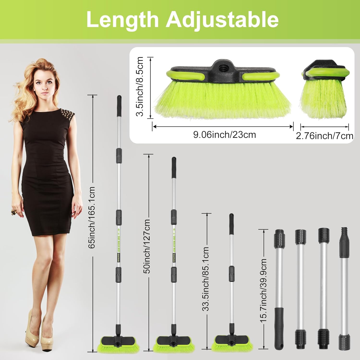 - 65“Long Handle Car Washing Brush Soft bristle cleaning brush handle consists of 4 sections of about 40cm aluminum rods, lightweight, durable and easy to carry. You can freely combine different lengths of car cleaning brush rods according to the place you want to clean (Extends to 16"/40cm, 34"/85cm, 50"/127cm, 65"/165cm), allowing you to avoid stretching, bending or twisting, and easily complete the car cleaning work.