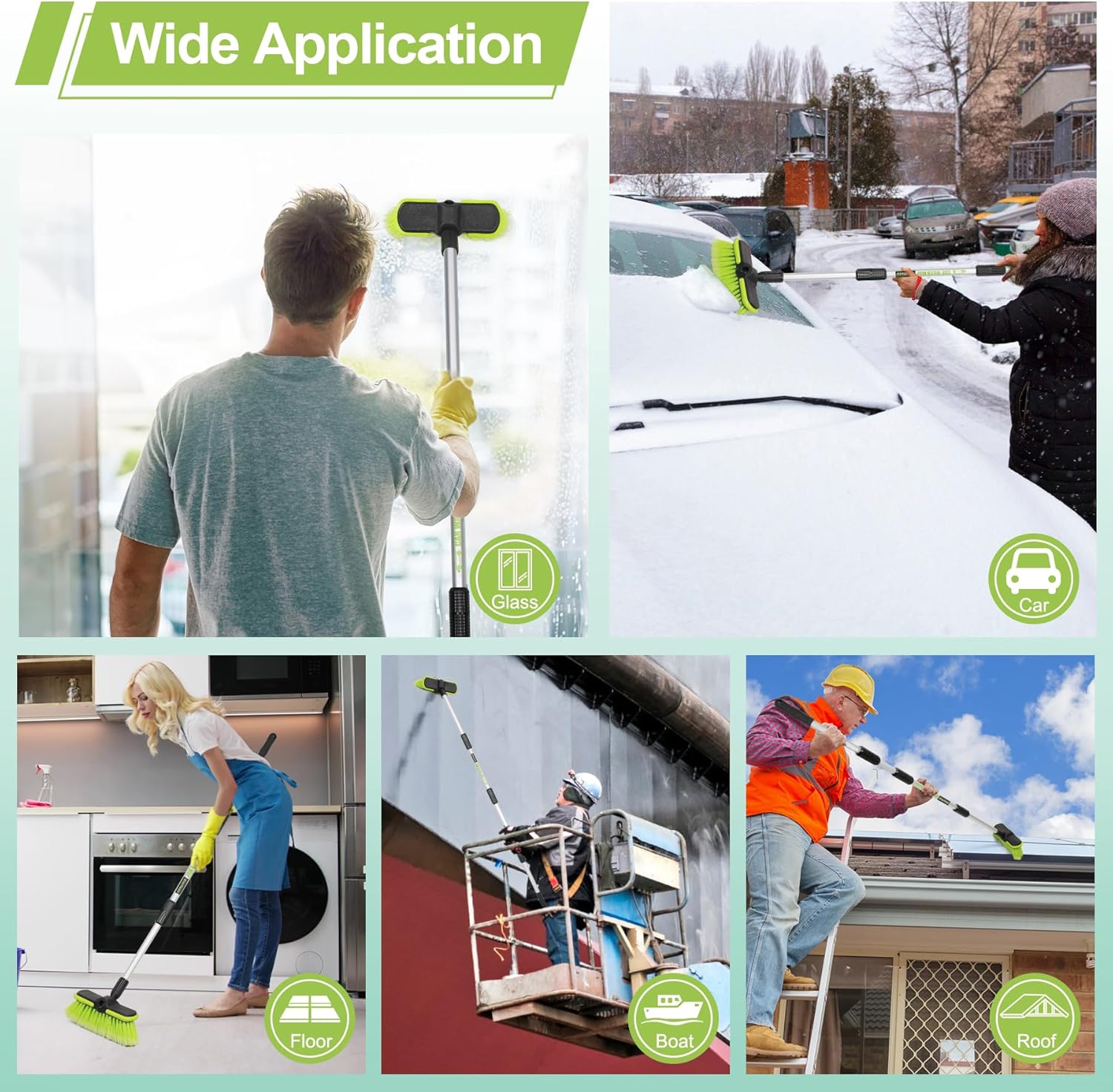 - Multi-purpose Car Washer Brush This car wash brush with long handle is versatile and practical. The car windshield snow brush is perfect for cleaning or washing solar panels, house siding, auto cars, trucks, SUV, RV, boats, driveways, decks, floors, patios, bathrooms, showers, remove snow during wintertime and more!
