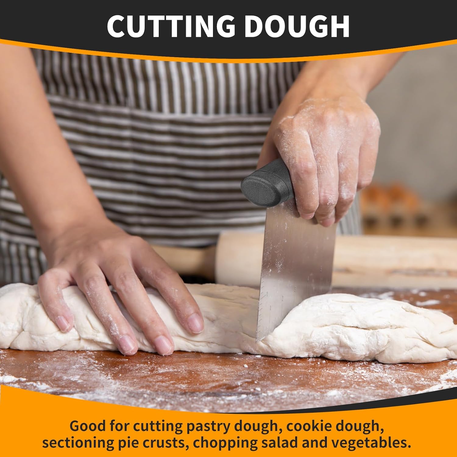 - Multi-purpose Dough Cutter: The bench scraper is a perfect gadget for household. The versatile kitchen utensils are not only designed to scrape dough effortlessly but can also be used as a kitchen scraper, baking scraper, dough knife, cake scrapper. Or used as a smoother for cake decorating or batter spreader. It's perfect to your kitchen essentials.