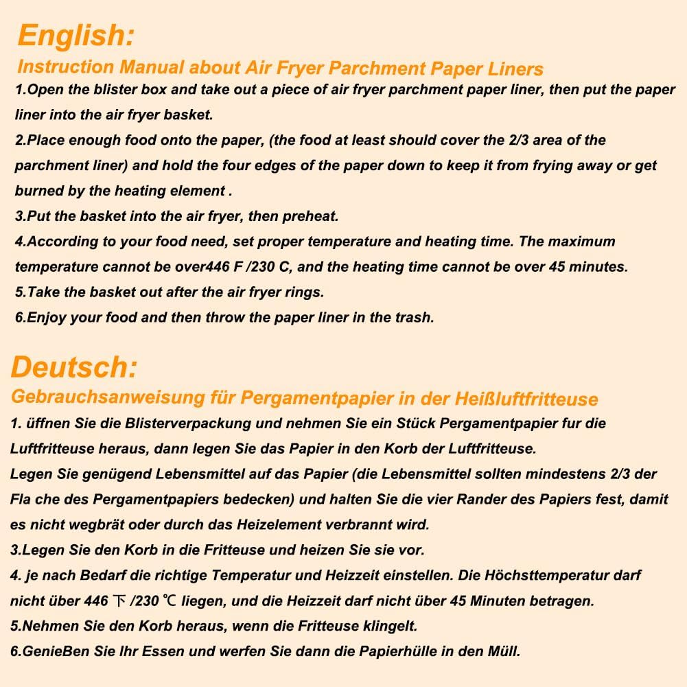 - HEAT RESISTANCE & EASY TO USE: Heat safe up to 450 degree F (232℃), Microwave and Oven safe. These non-stick disposable air fryer filters are all with bowl shape and exact size, no need cut or fold. Just put the paper liners in the basket and then throw into a rubbish bin after use