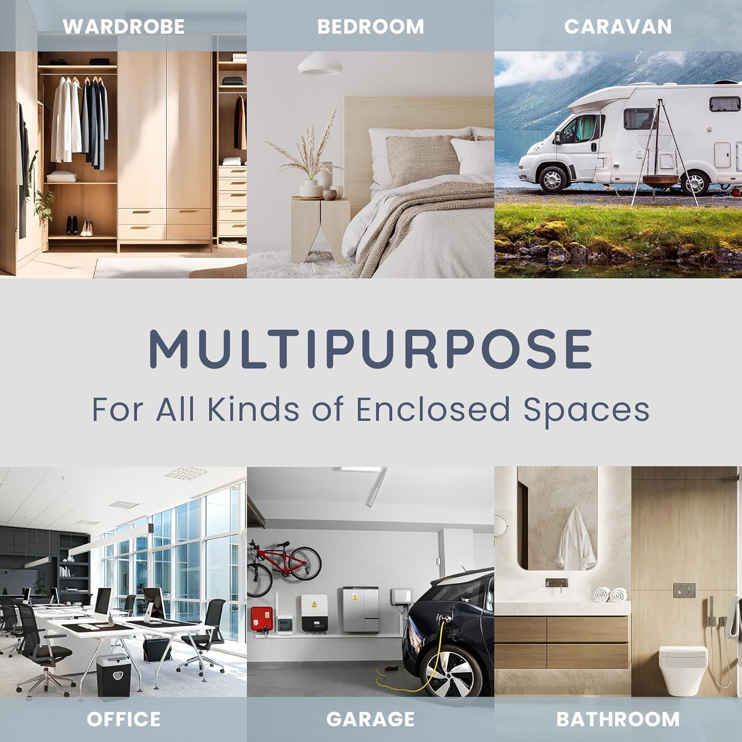 - COMPACT AND PORTABLE DESIGN: Each unit measures 15 x 15 x 10 cm and has a 500ml capacity. The lightweight and portable design allows you to easily move the dehumidifiers between rooms, making them ideal for areas prone to damp, like bathrooms, wardrobes, and kitchens.