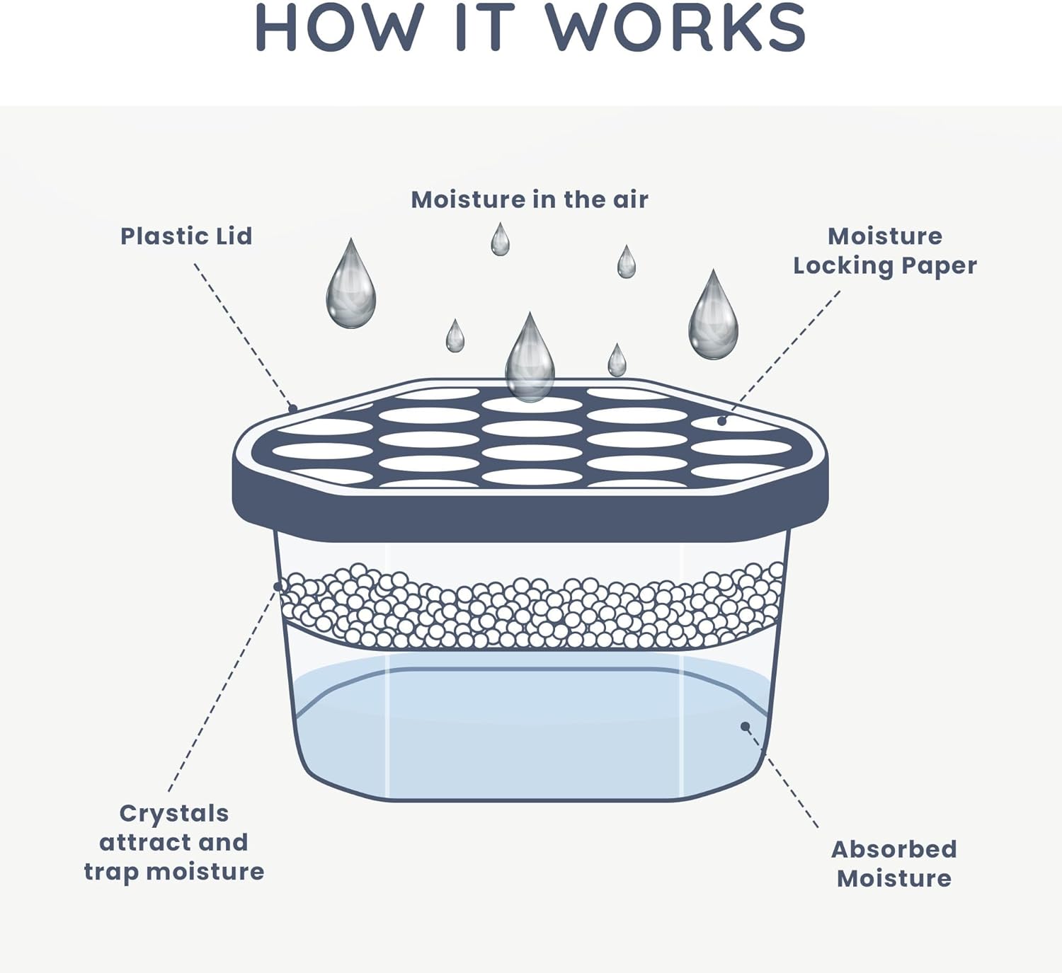 - EASY TO USE AND EFFECTIVE: Simply remove the foil and place the tub in the desired area. Each unit absorbs up to 3 times its weight in water, using hydrophilic crystals designed to efficiently capture and retain moisture. Important: Do not remove the white safety sheet.