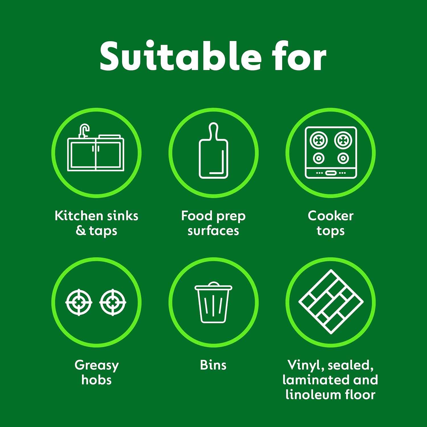 - SUITABLE FOR: kitchen and bathroom sinks & taps, kitchen work surfaces, cooker tops, sealed wood surfaces, glass surfaces, draining boards, greasy hobs, bins, vinyl and sealed laminated floors and linoleum.