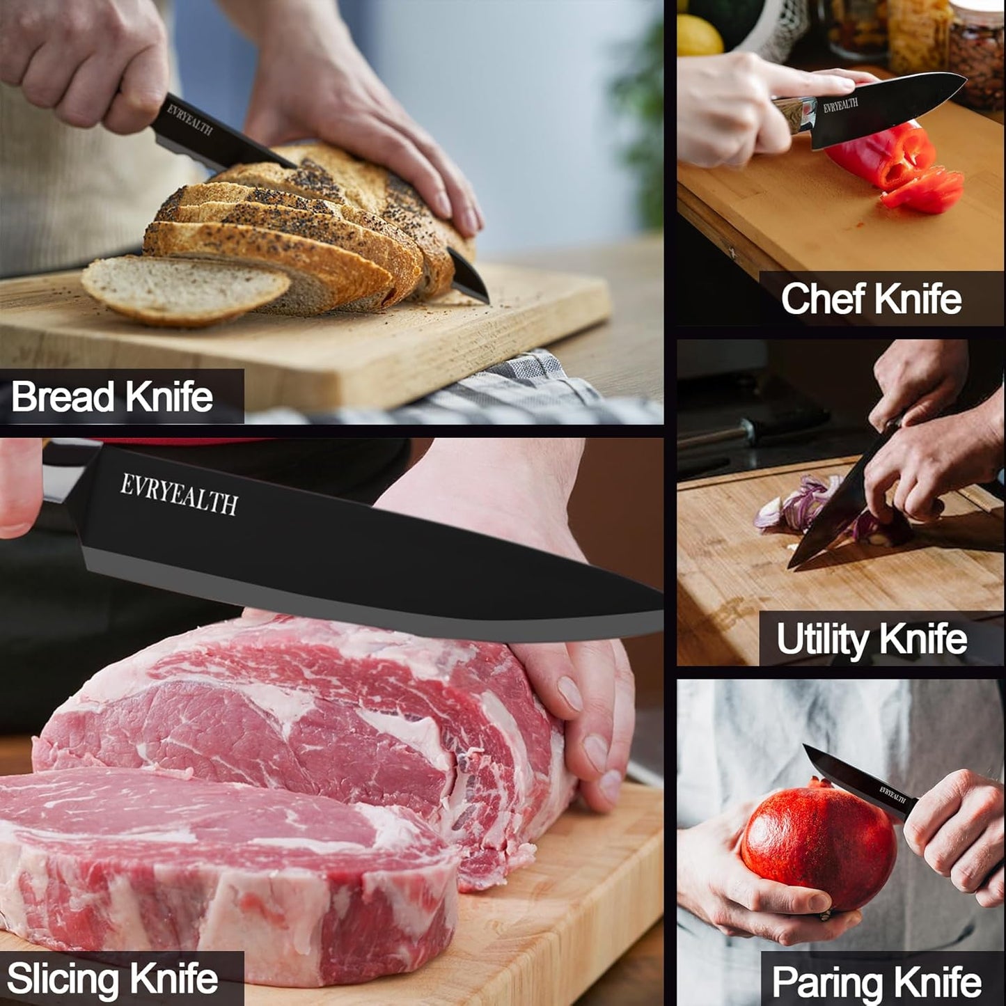 - [Multifunctional knife set] This knife can be used for cutting all kinds of meat, bread, vegetables and fruits. The kitchen knives allow you to slice, dice and dice with ease, increasing your cooking efficiency.