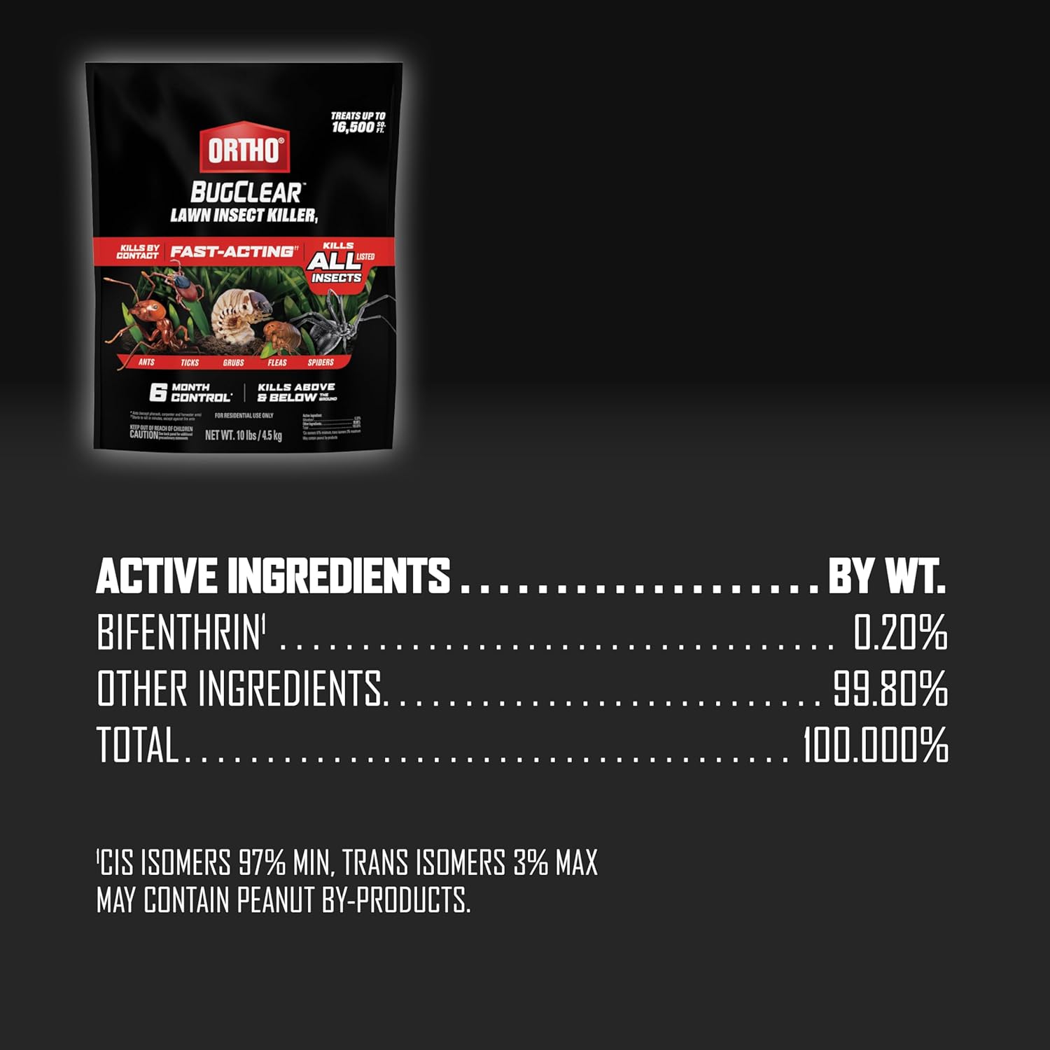 Take back your lawn with Ortho Bug Clear Lawn Insect Killer1, a powerful and fast-acting solution that kills a wide variety of outdoor pests. Designed to treat up to 16,500 square feet, this 10 lb. bag delivers effective protection against ants, spiders, ticks, fleas, armyworms, grubs, and other common lawn insects.