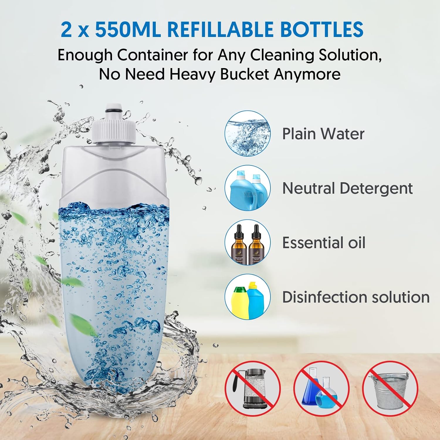 - [2PACK 550ML Large Refillable Bottle]: The microfibre spray mop for floors comes with 2 water tank for replace, you can add your favorite cleaning solution (Except boiling water) into the bottle of the tile floor mop,so that you don't need to carry with a heavy bucket anymore,just add water and the right amount of detergent in to the mop bottle, you will get your house floor thoroughly cleaned easily with this cleaning mop for hard floors. It's so time-saving and labor-saving, even water-saving.