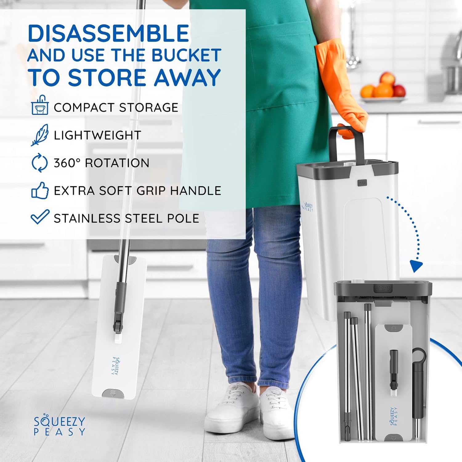 SqueezyPeasy Premium Flat Mop and Bucket Set - Separates Clean & Dirty Water - Compact & Lightweight - 3 Chamber Floor Cleaning System - 360 Rotating Head - 5 Microfibre Reusable Mop Pads Included