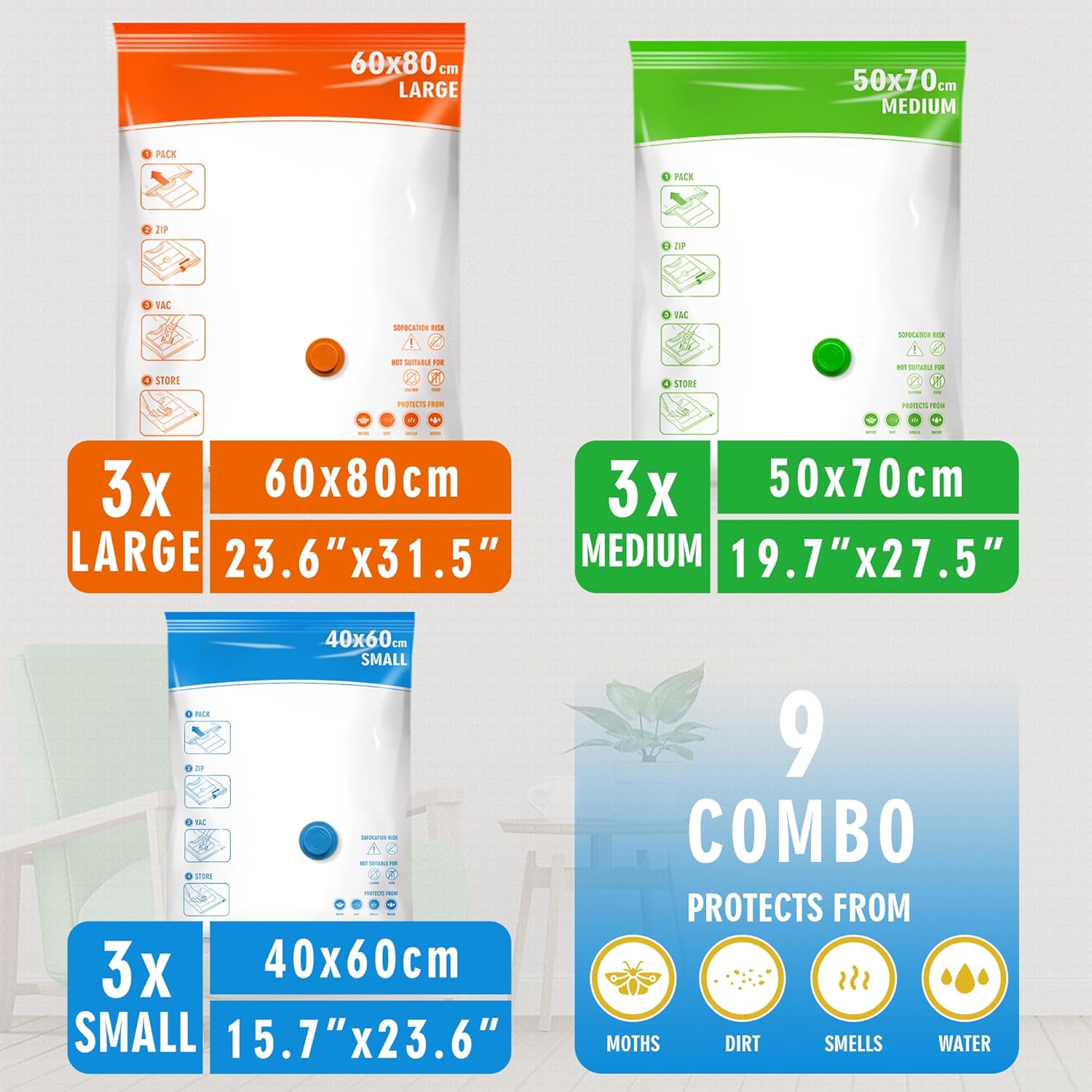 - 9 x MIXED SIZE BAGS (3 SMALL, 3 MEDIUM, 3 LARGE) Vacuum Storage Bags offer a perfect solution for storage, with which you can put away your seasonal clothes, comforters and blankets, pillows and more. Easily create 80% more space!