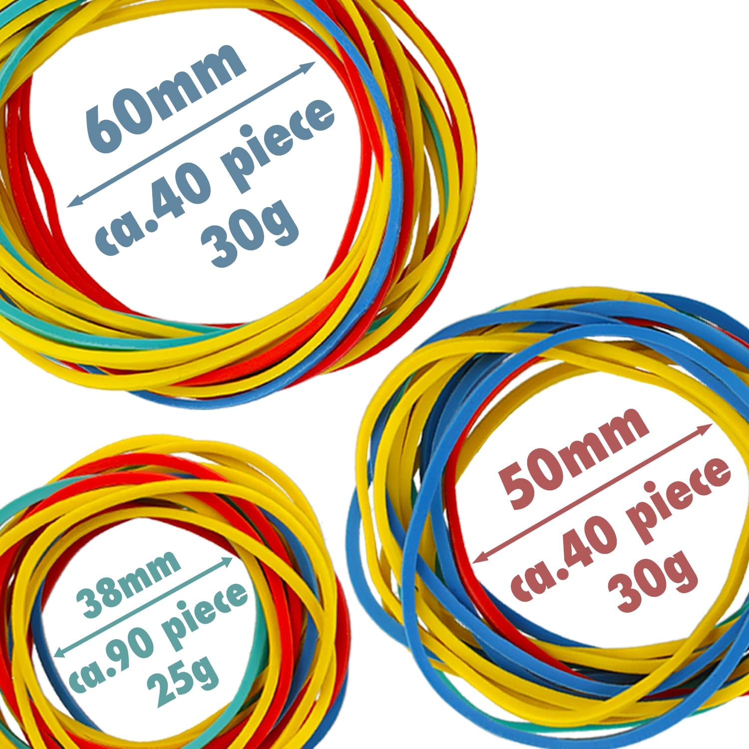 - Rubber bands always handy in the storage pack - contains 30g of rubber rings with a diameter of 60mm, 25g of rubber rings with a diameter of 50mm and 25g of rubber rings with a diameter of 38mm.