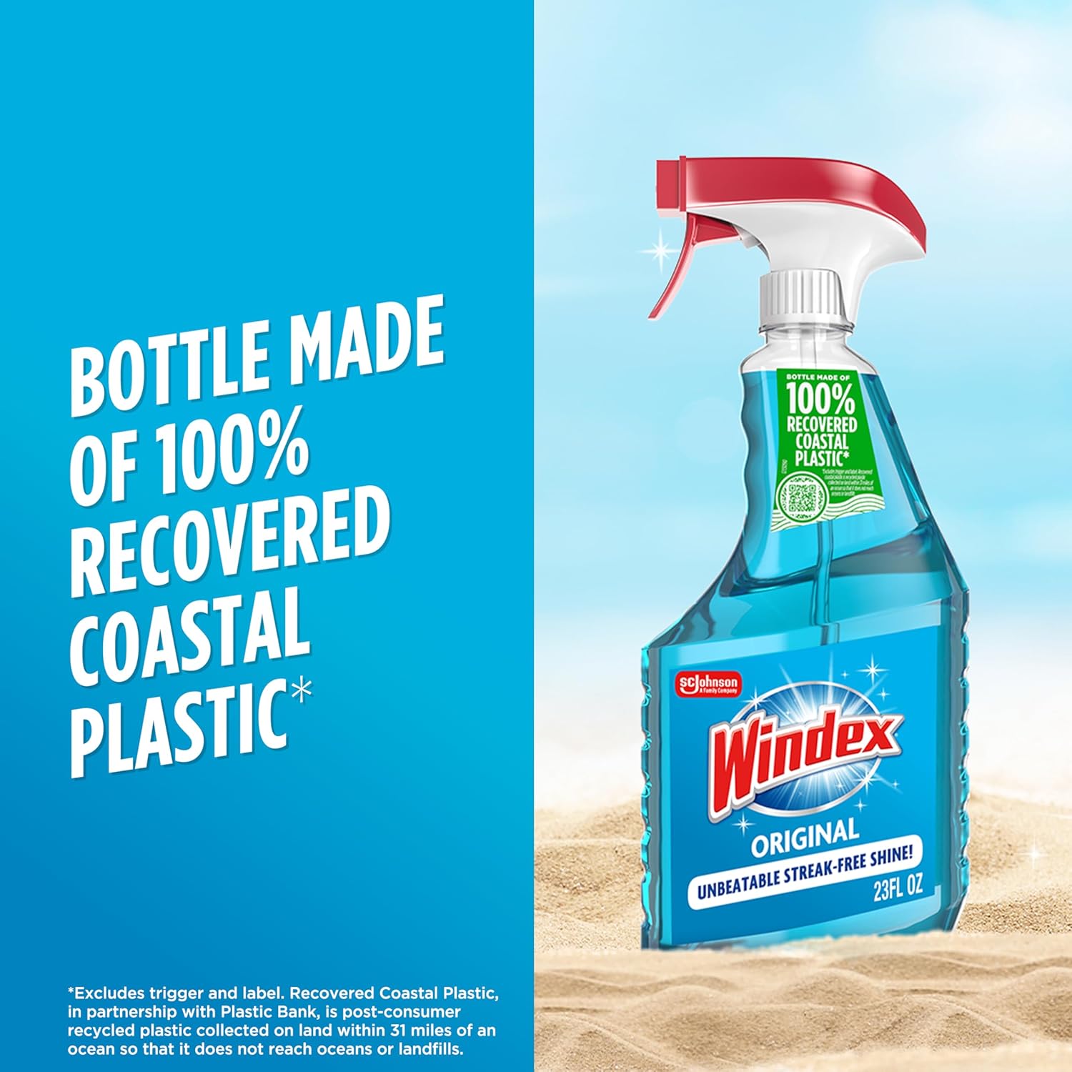- Windex Commitment: spray bottles made from 100% recovered coastal plastic in partnership with Plastic Bank, is post-consumer recycled plastic collected on land within 31 miles of an ocean so that it does not reach oceans or landfills.