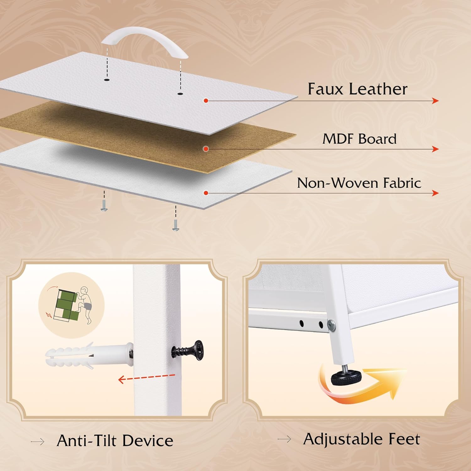 - Durable Quality Material The drawer consists of 3 layers of high-quality fiberboard, easy-to-clean and breathable non-woven fabric, the desktop is made of P2 grade artificial wood, scratch resistant and easy to clean, the material process and safety are strictly tested by EPA&SGS, health and environmental protection, excellent quality for you and your family to create a peaceful life!