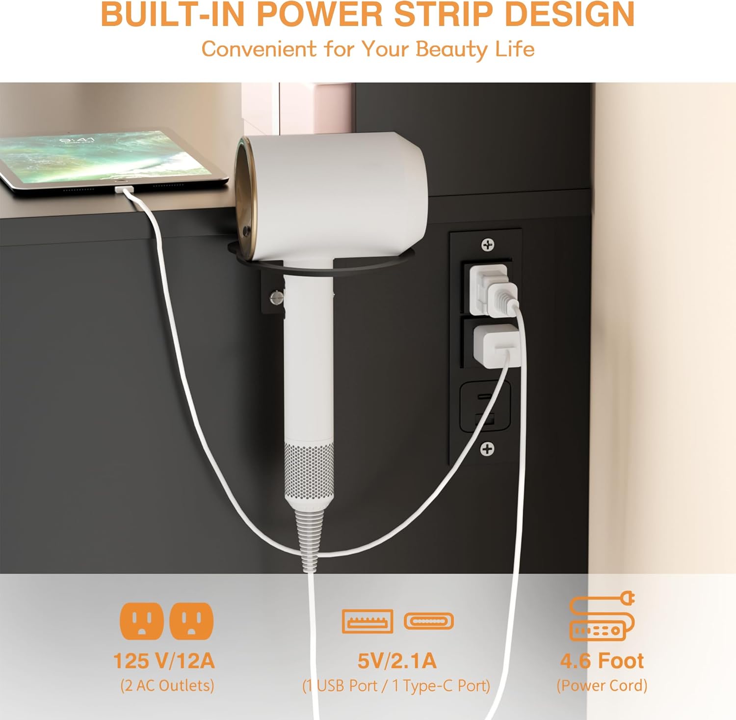 - Power Outlet & Hair Dryer Holder: The dresser comes with a convenient charging station as well as a hair dryer holder. There are 2 outlets on the side of the dresser, 1 USB port and 1 Type-C port. You can blow dry your hair in front of the vanity while easily charging your cell phone or other electronic devices.
