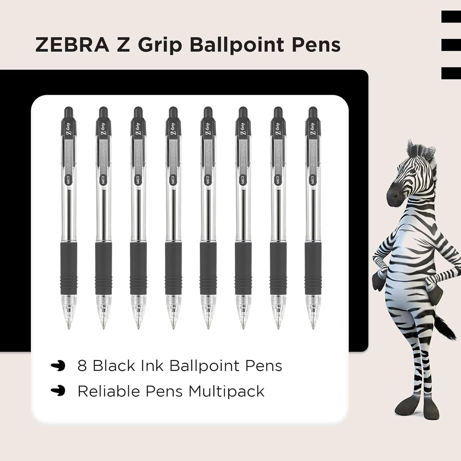 Zebra Pen Z Grip Black Ballpoint Pens with Pocket Clip 8pk, Retractable Black Ink Ballpoint Pens, Reliable Black Biro Pens Multipack for Everyday Use Design, New Pack Size 8pk