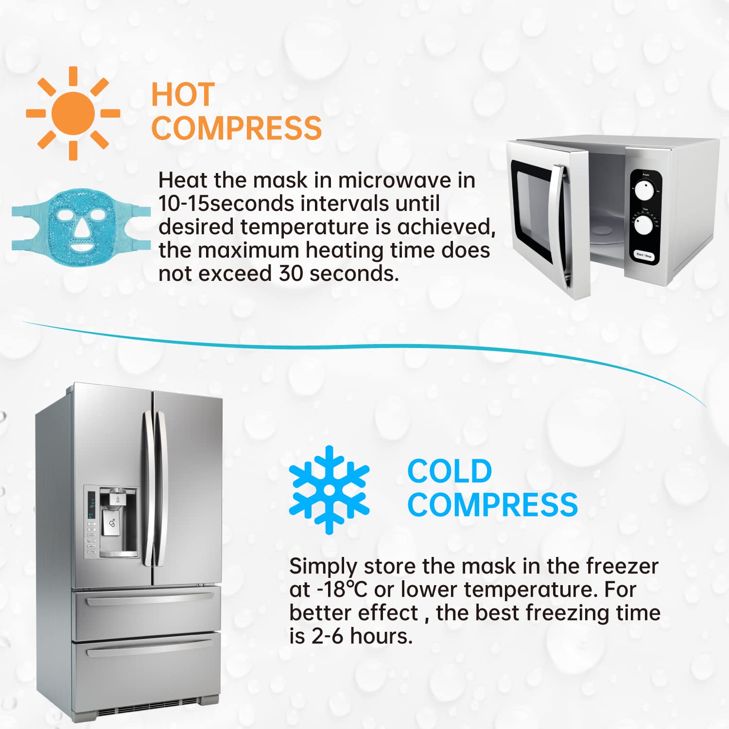 - CONVENIENT TO USE simply store the mask in the freezer at -18℃ or lower temperature for at least 2 hours. Heat the mask in microwave in 10-15seconds intervals until desired temperature is achieved, the maximum heating time does not exceed 30 seconds.